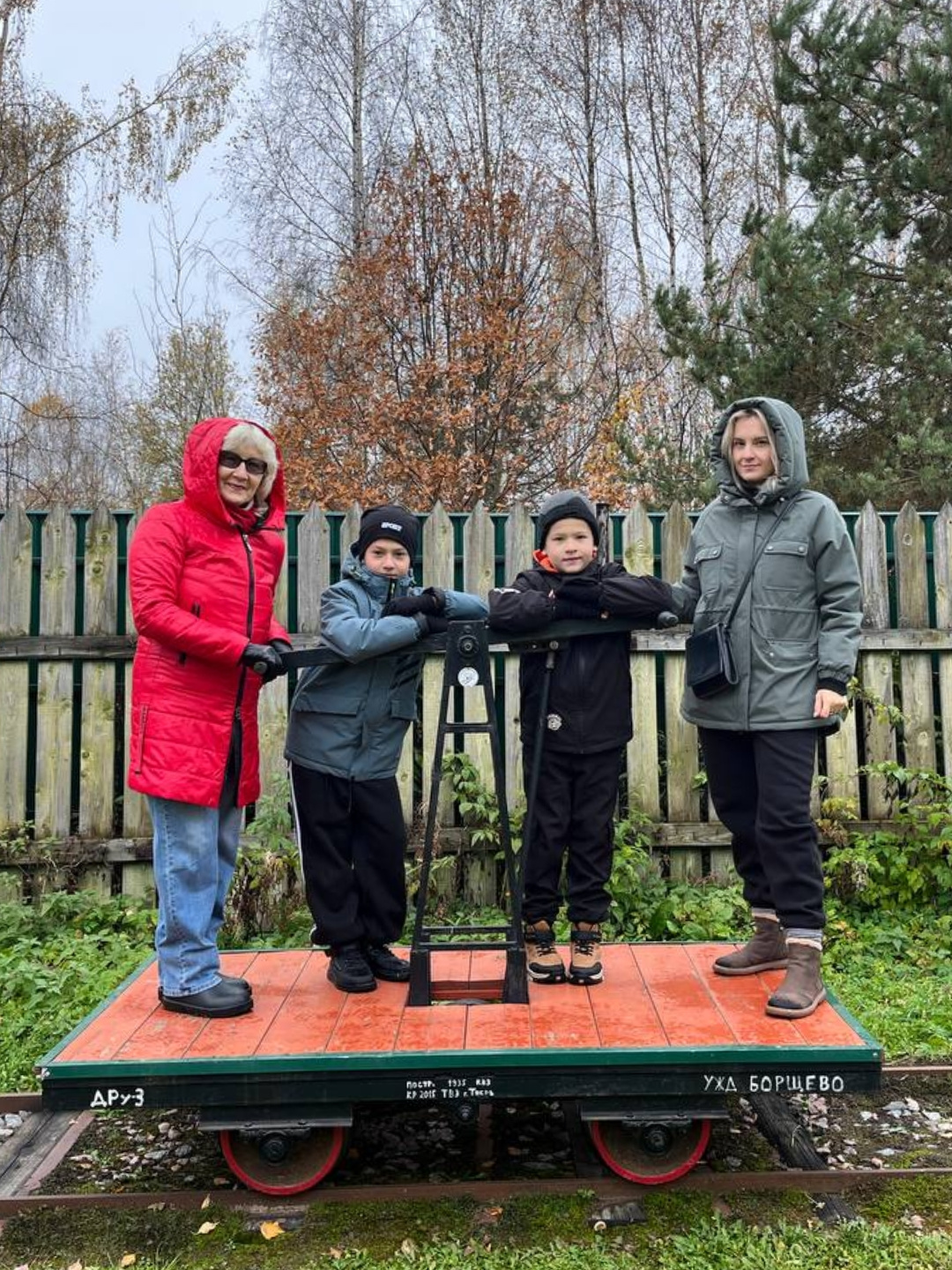 Наступает поздняя осень, но в саду ещё есть яблоки, а опадающие листья ложатся на наши инсталляции и узкоколейку, придавай шарма и атмосферности. Осень на даче прекрасна. В чем убедились наши гости сегодня. 2 часа пролетели незаметно. А ручная дрезина и самовар отлично согрели в прохладный осенний день.