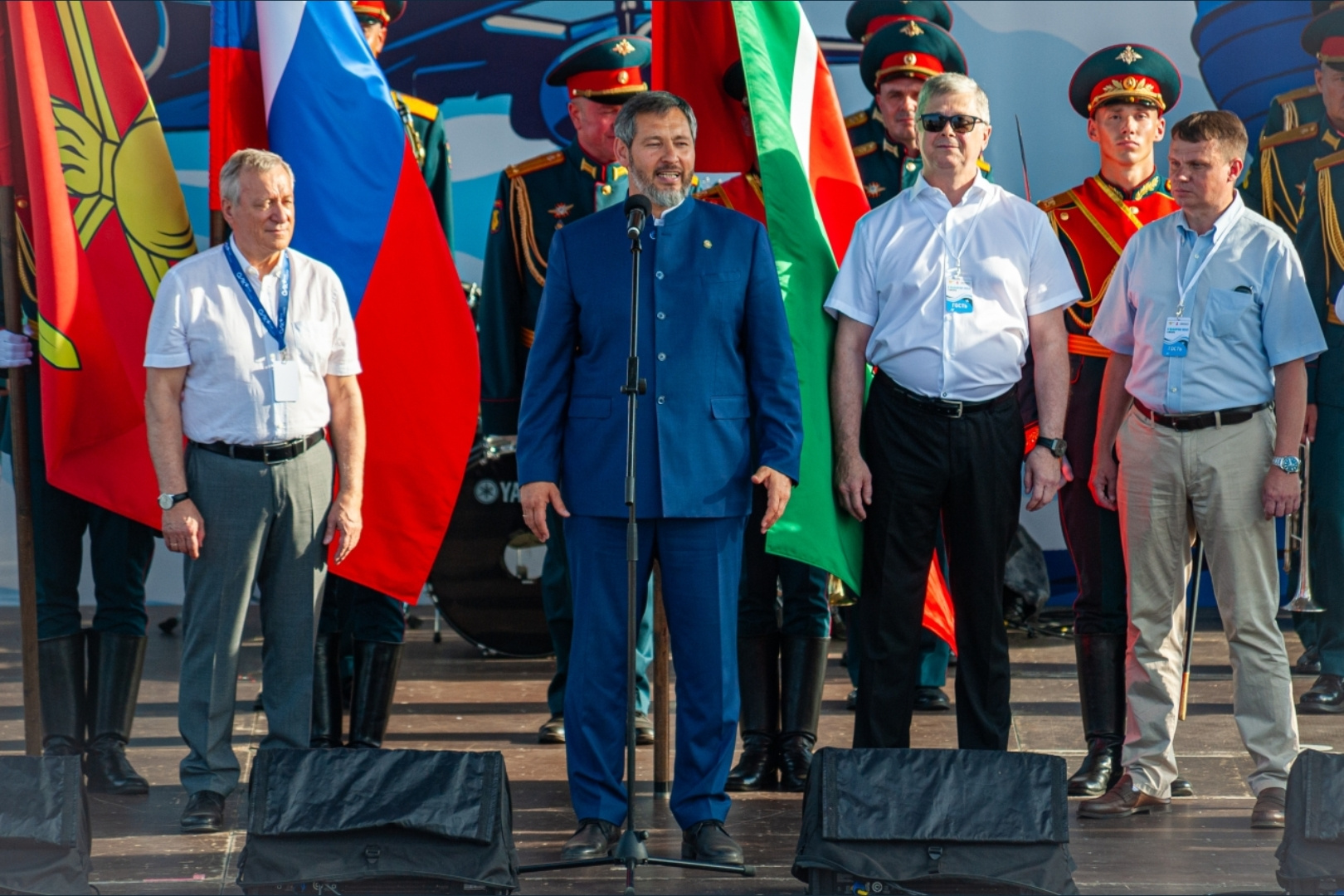 После этого на сцене, установленной неподалёку, состоялась официальная церемония открытия, с приветственной речью на которой выступили министр промышленности и торговли Татарстана Олег Коробченко и управляющий директор АО «Туполев» Александр Бобрышев.