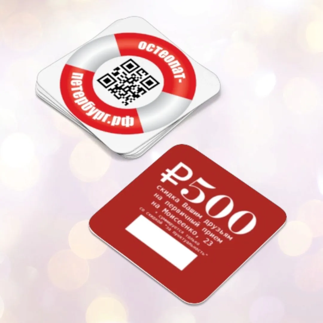 Теперь на визитке будет место для идентификации дарителя, т.е. Вас. И, после того, как Ваш друг обменяет визитку на скидку, Вам придет приятный сюрприз в виде промокода на любой вид приема.